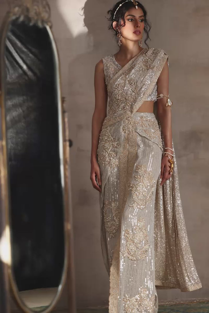 Step into a world of enchantment with this exquisite silver sequin fabric saree, a radiant embodiment of grace and glamour. Each shimmering sequin casts a spell of elegance, creating a mesmerizing backdrop for the intricate tapestry of gold, silver, and ivory machine-embroidered motifs that adorn its surface.