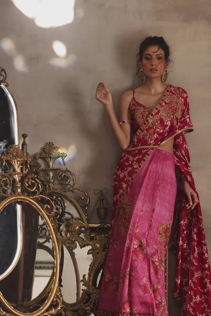Adorned with delicate vintage floral motifs, each intricately enhanced with meticulous Zardozi work, this saree exudes an aura of regal splendor. The meticulous craftsmanship adds depth and dimension, creating a mesmerizing tapestry of tradition and contemporary finesse.