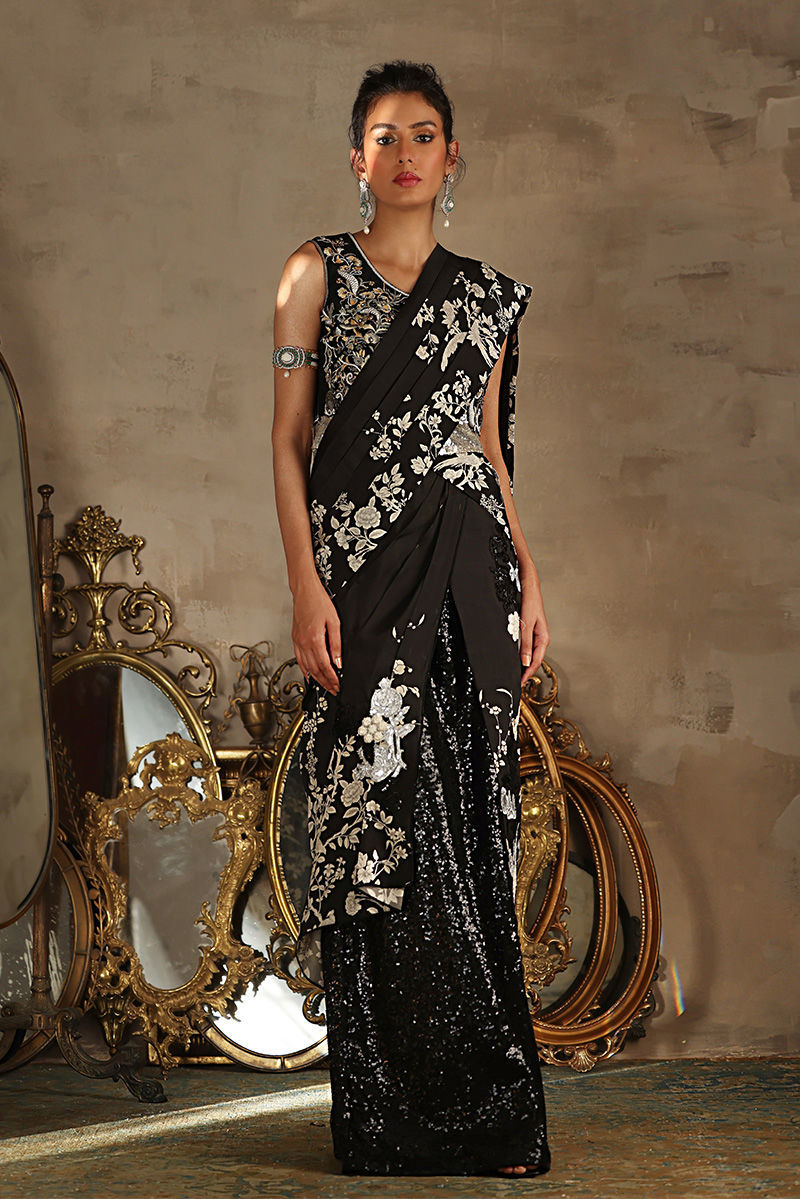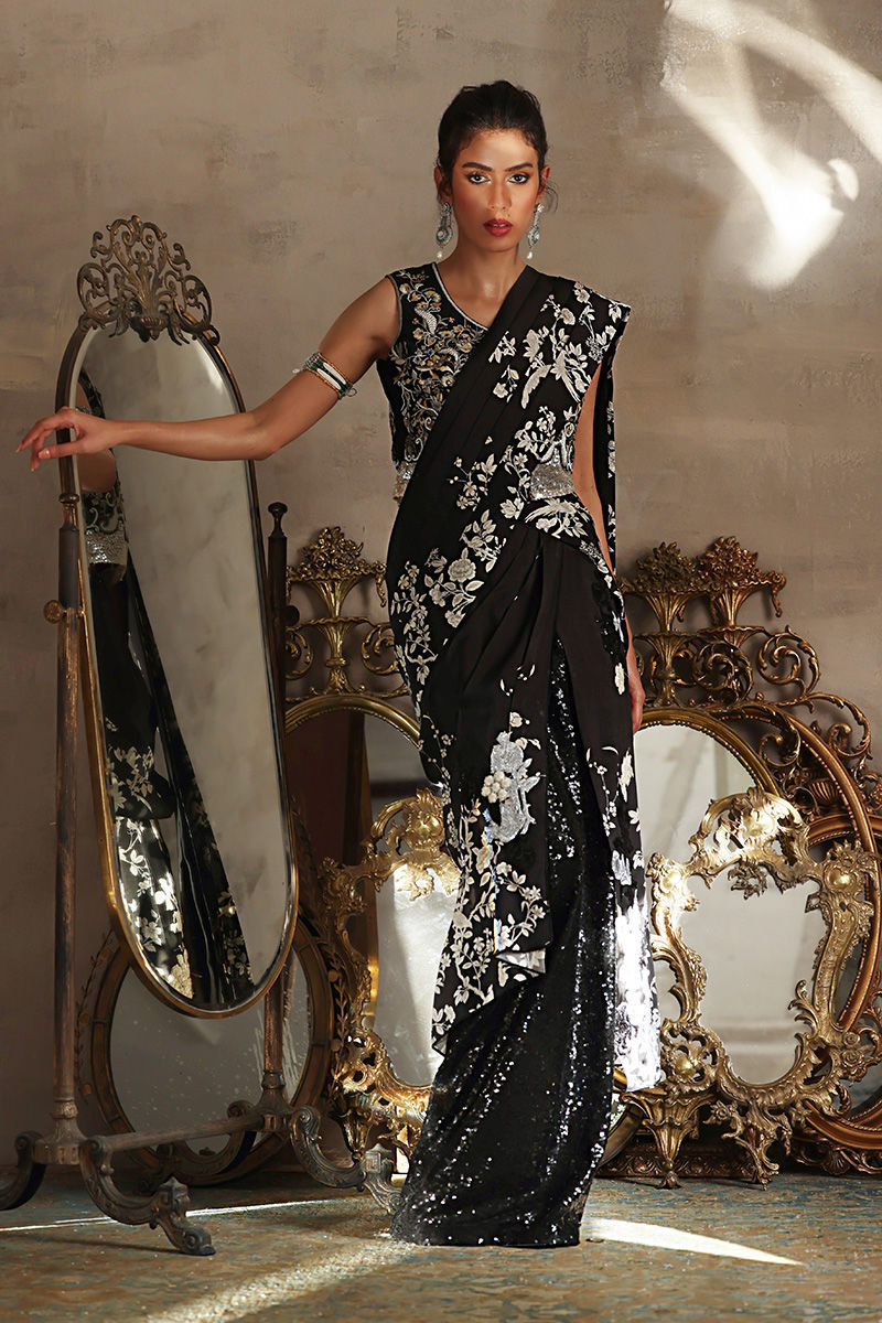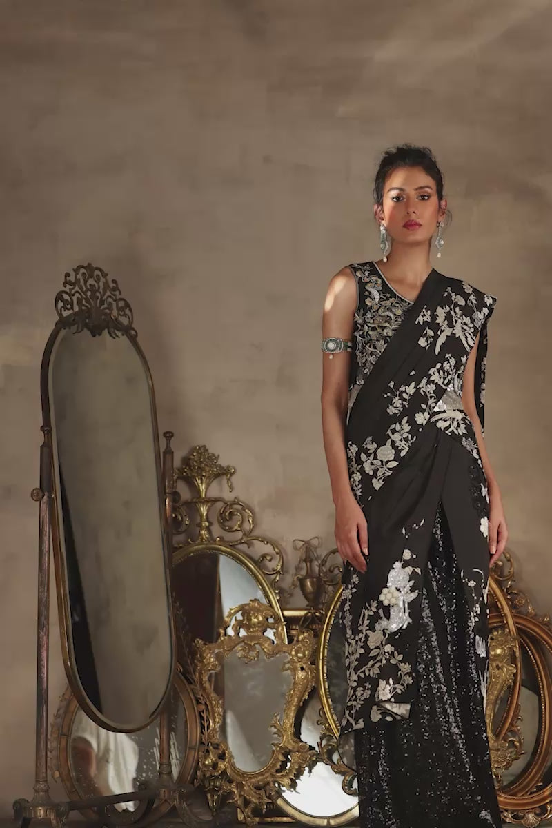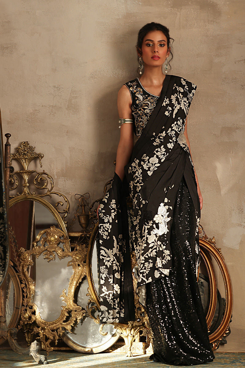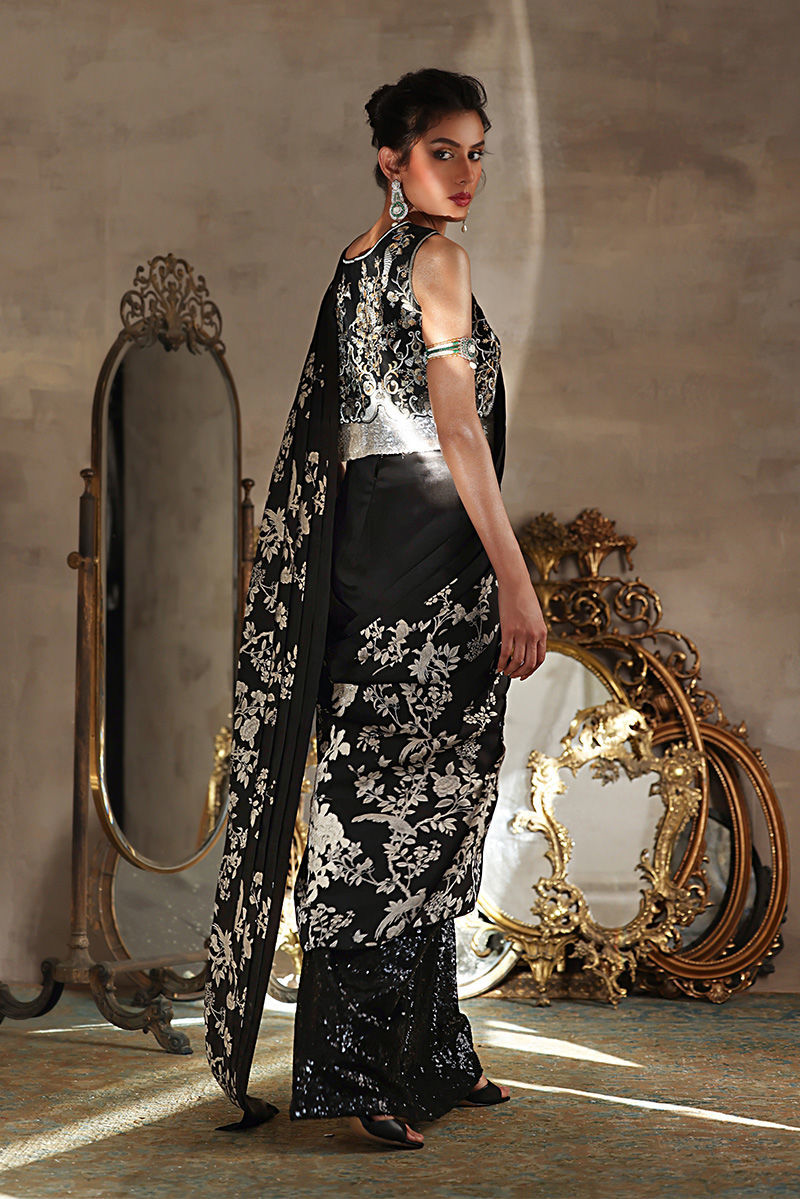 Indulge in the timeless elegance of Silk fabric with this exquisite saree, a harmonious blend of modern allure and vintage charm. Crafted to drape gracefully, the saree embodies sophistication and femininity with its flowing texture and luxurious feel. Beautiful machine embroidered silver,black and ivory floral motifs appliqued on the font of the saree.