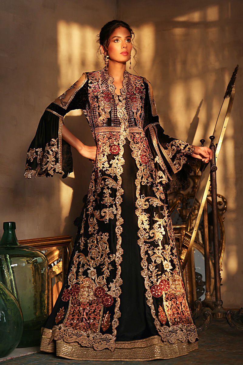 Paired with a long flowy kaali dress, the ensemble exudes sophistication and grace. The dress is finished with machine embroidered golden lace, adorned with sequins that catch the light with every movement, casting a spell of enchantment.