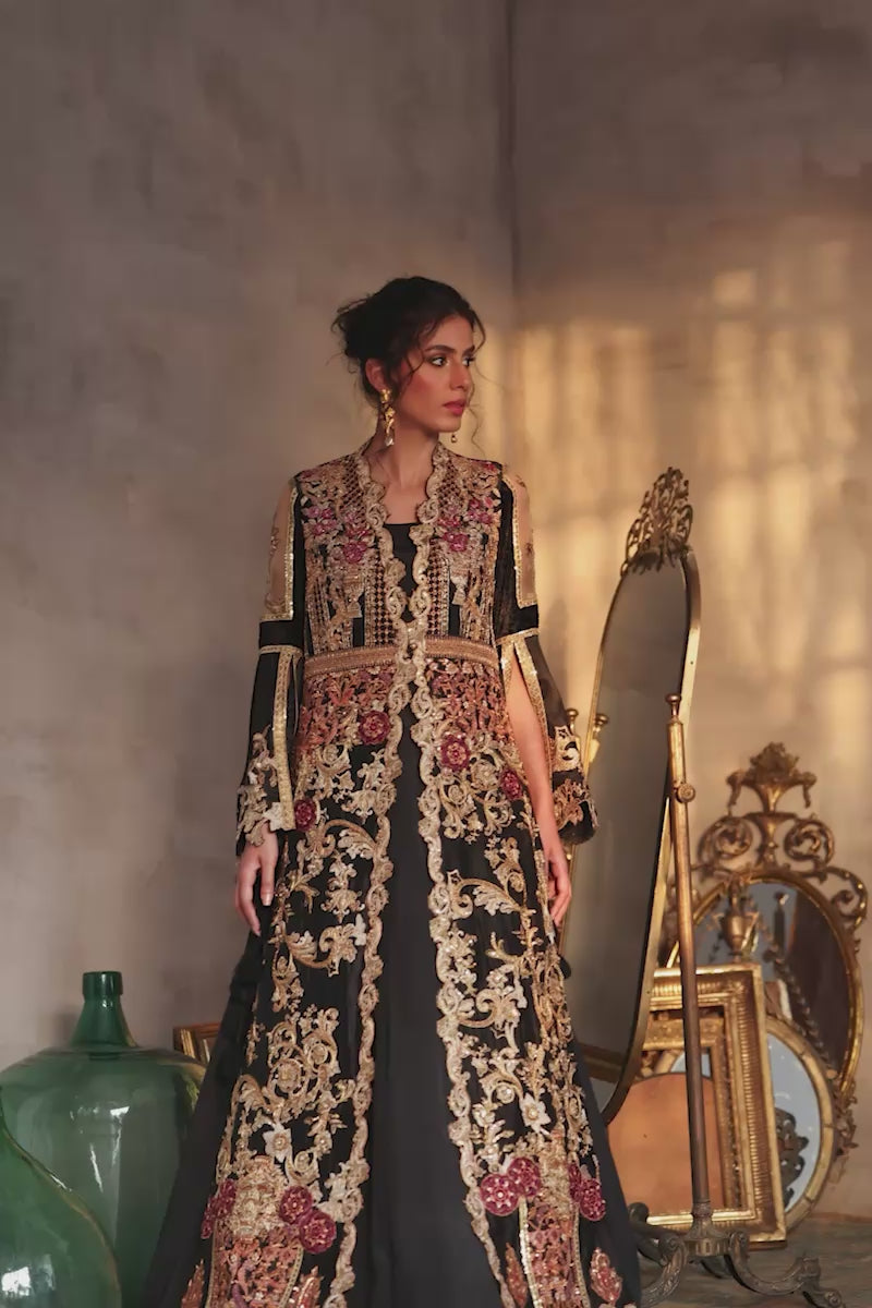 Embrace the timeless elegance of tradition with this captivating black front-open long jacket on silk fabric, a masterpiece of artisanal craftsmanship. The jacket is a harmonious blend of hand and machine embroidery, adorned with a rich tapestry of ivory, gold, and coffee-colored resham threads that weave together to create intricate motifs enhanced with delicate zardozi work, each telling a story of heritage and beauty.
