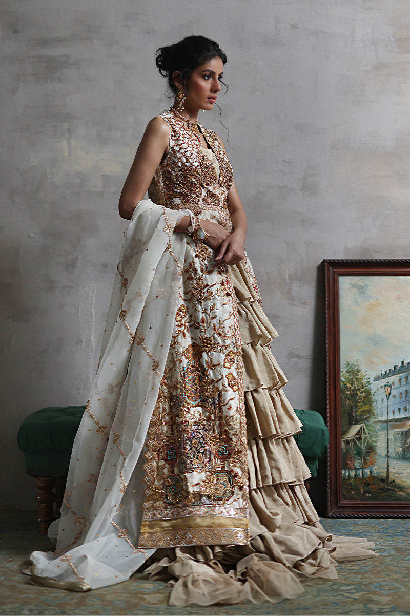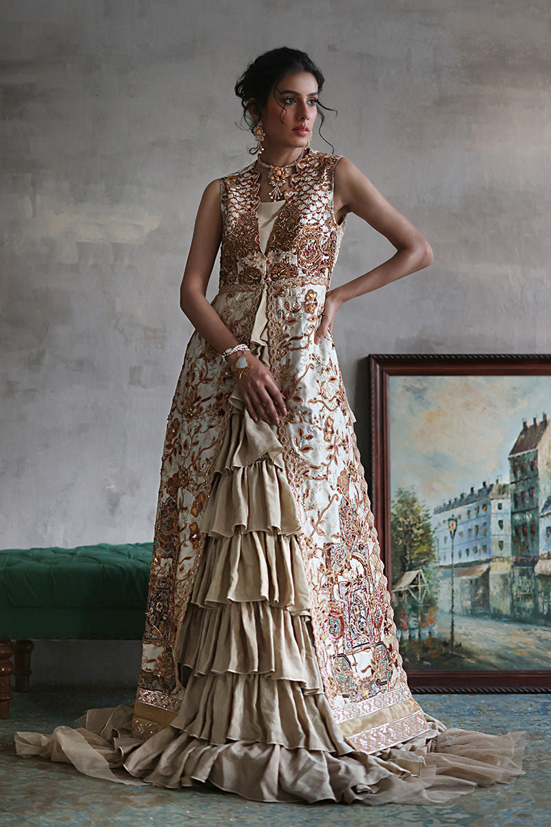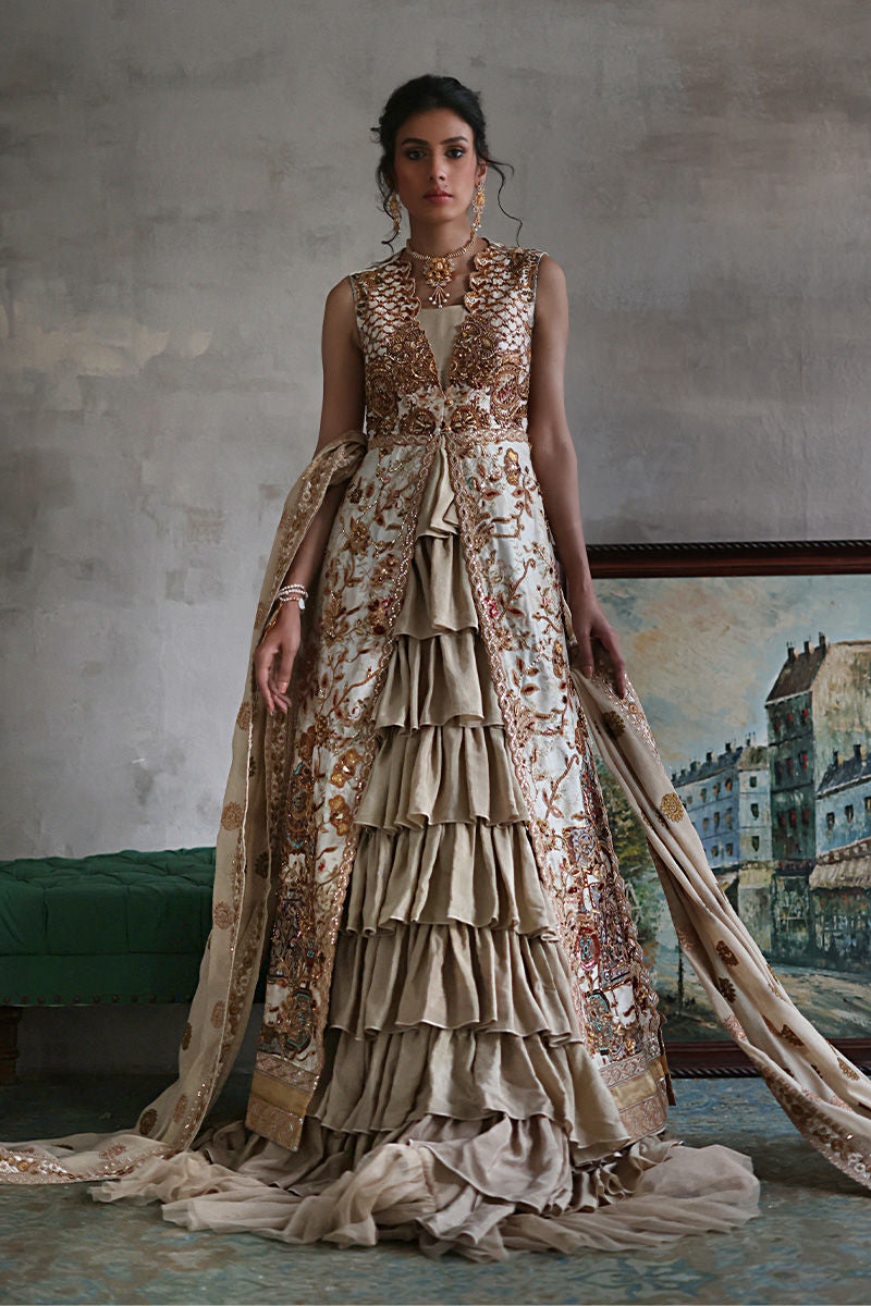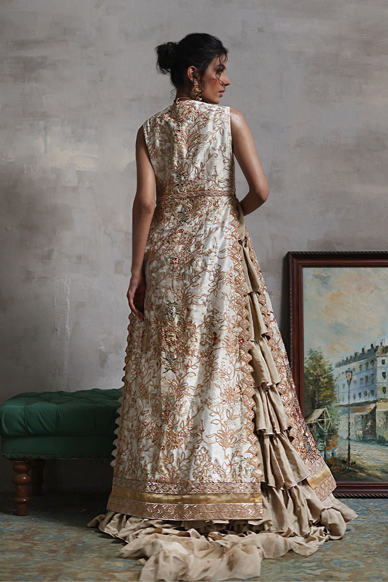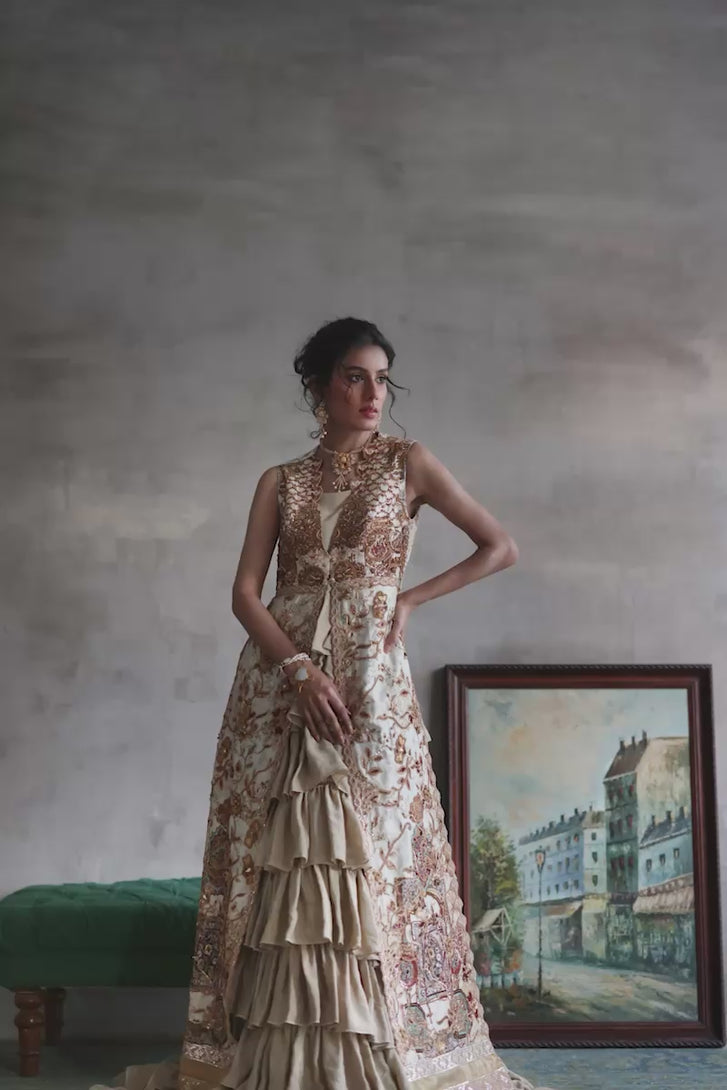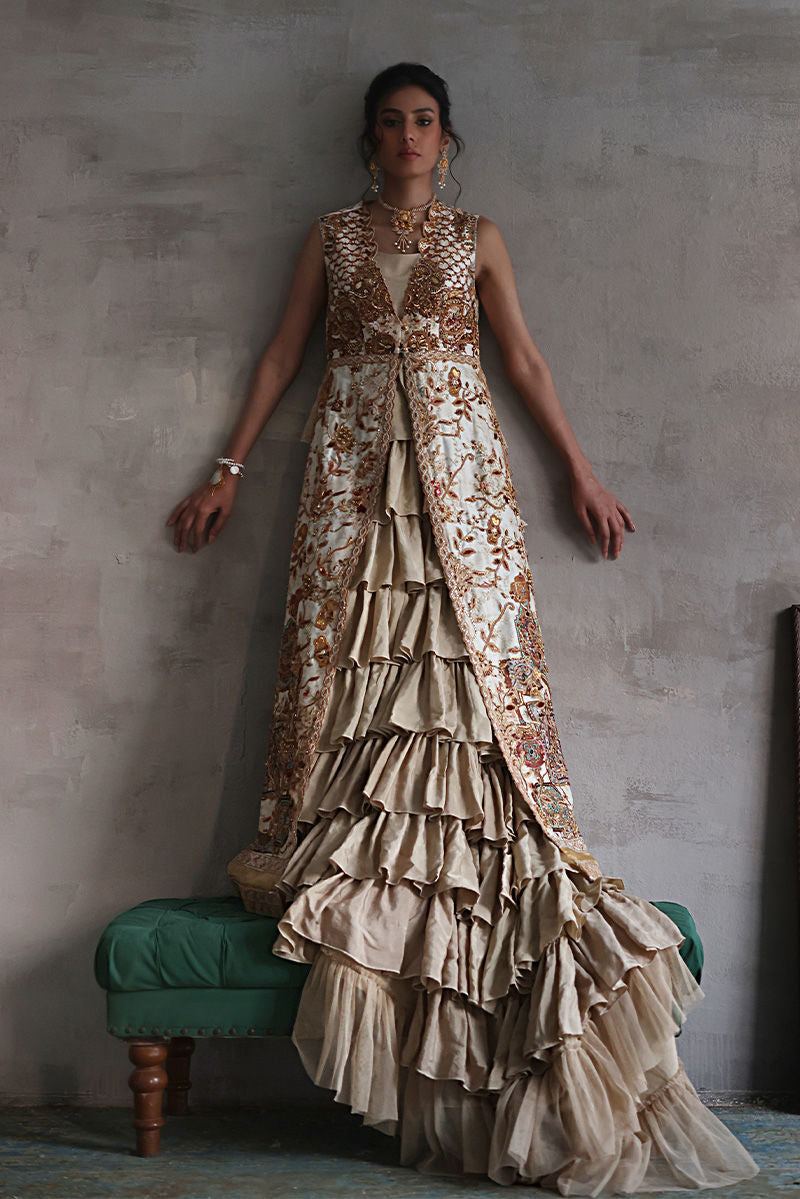 This stunning ensemble features a long front open ivory jacket crafted from silk fabric, adorned with an ivory textured print. The jacket is adorned with industrial machine tile embroidery throughout the print, elevated by intricate zardozi work. Completing the look is a machine embroidery lace finishing, adding a touch of elegance. It's paired with a long layered inner for a cohesive and sophisticated appearance.