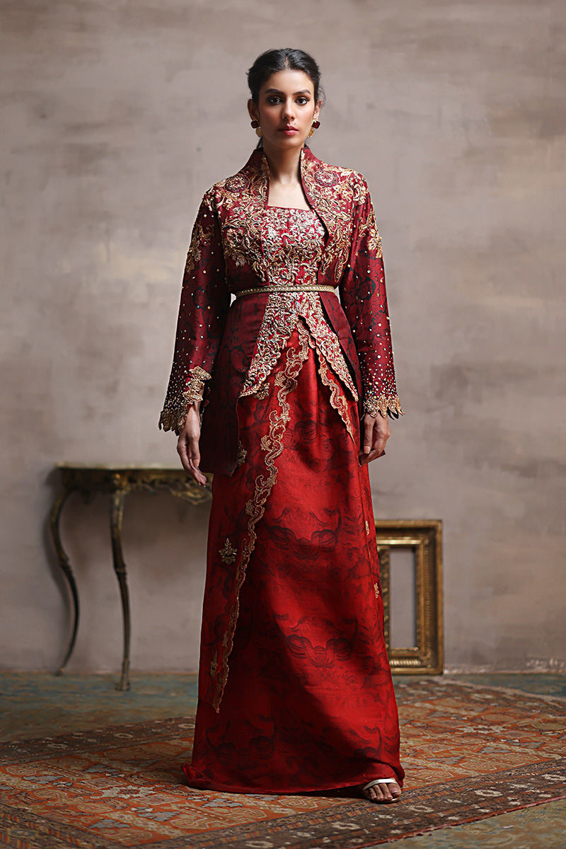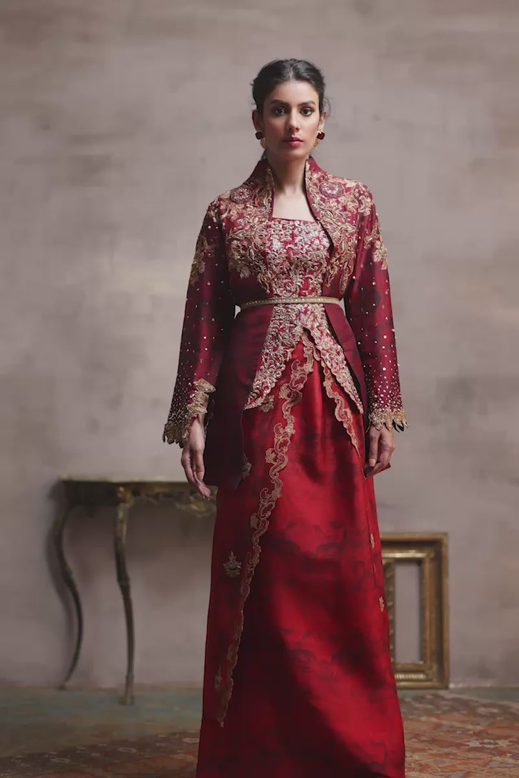 This ensemble features a rich dark maroon silk fabric with an intricate printed texture. The printed jacket boasts a golden outline and is adorned with resham thread work, further enhanced by hand zardozi detailing. The fitted inner is beautifully crafted with machine embroidered tila jaal, also embellished with zardozi work. Completing the look is a long layered skirt finished with a printed scalloped border, adding an elegant touch to the overall ensemble.