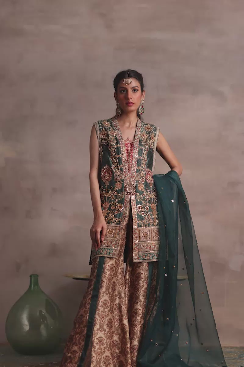 This breathtaking outfit is a masterclass in fusion fashion, combining timeless traditional techniques with modern sophistication made from silk. The jacket is a work of art, featuring intricate handwork embroidery on both the front and back, replete with zardozi, tilla, cut dana details, and sparkling stones, all expertly finished with industrial borders. Paired with wide-legged pants boasting vibrant prints and stylish front slits, and a flowing organza dupatta adorned with delicate embroidered borders and floral spray, this ensemble exudes elegance and versatility, perfect for making a statement at any occasion.