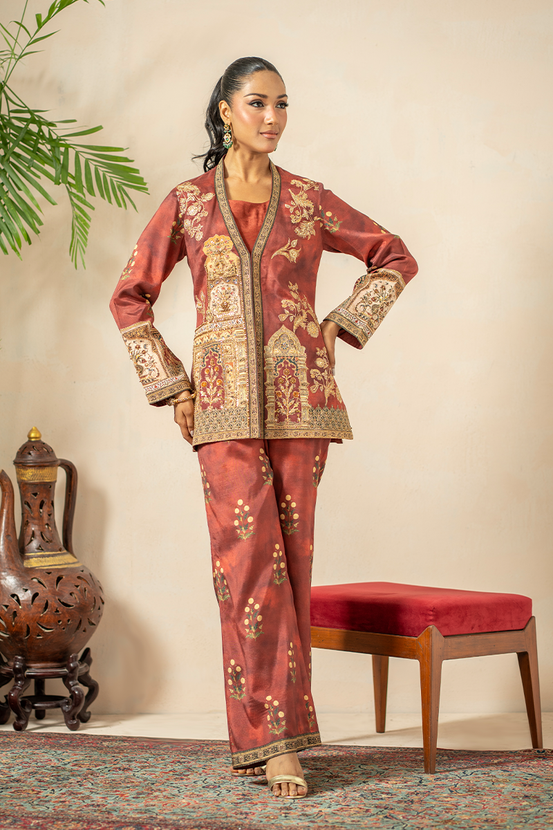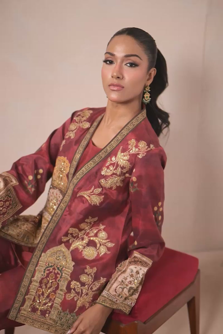 A rich crimson ensemble featuring ornate heritage-inspired embroidery, gold detailing, and Shamaeel’s signature artistic prints, a timeless statement of luxury and culture. This striking crimson jacket set embodies the essence of Shamaeel Ansari’s couture universe - regal, artistic, and effortlessly wearable. The jacket features a deep maroon base enriched with antique gold threadwork, intricately composed front panels, and Mughal-inspired architectural motifs. The sleeves are adorned with elaborate border embroideries, reflecting a beautiful interplay of tradition and modern expression. The straight pants carry complementing motifs creating a cohesive and elegant look. Paired with a matching inner lining, this ensemble stands out for its rich tones and impeccably balanced embellishment. Perfect for festive gatherings, winter soirées, intimate weddings, and high-end formal occasions — this outfit celebrates heritage craftsmanship with a contemporary silhouette.