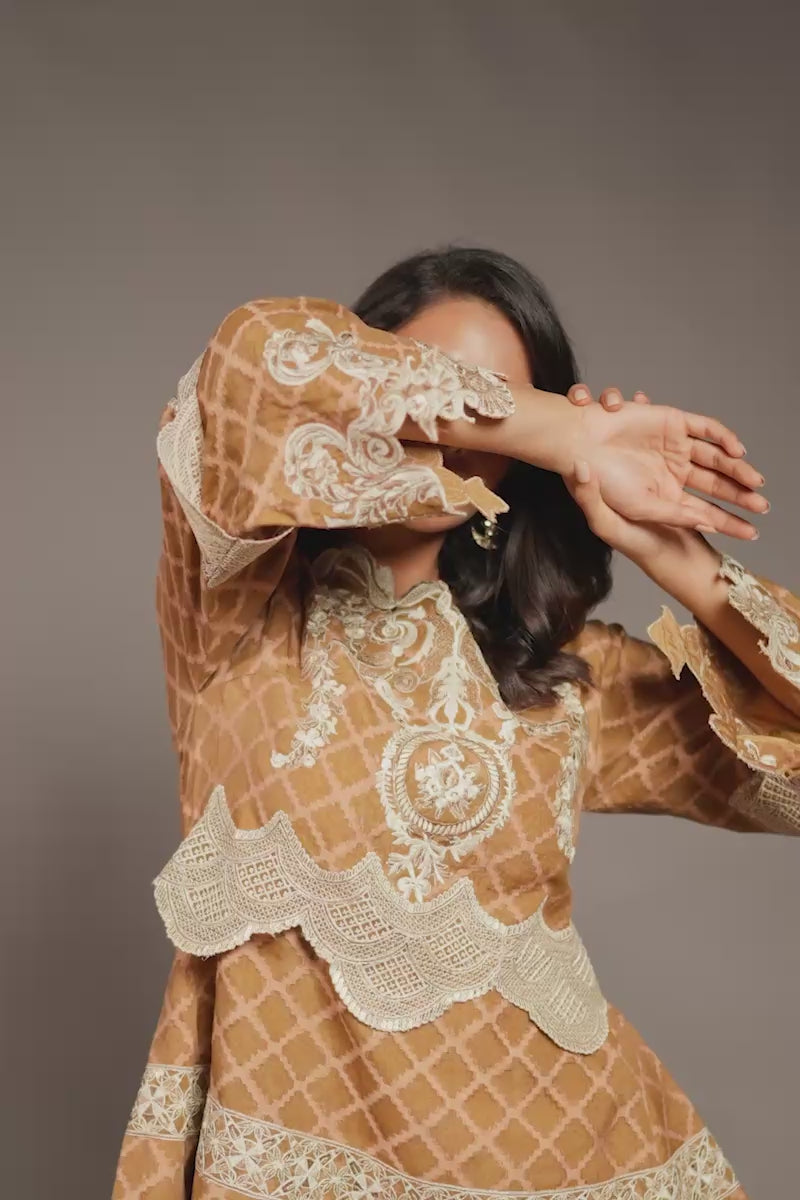 This A-line shirt with a flared pant in self-jacquard features ivory embroidery with sequins, scalloped sleeves, and a scalloped border, blending traditional artistry with modern elegance. Comes with flaired pant.