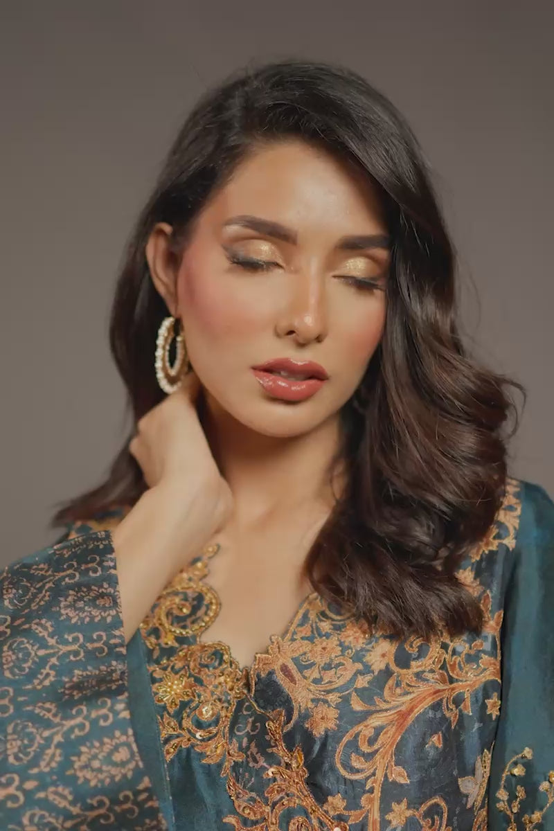 Crafted from luxurious silk, this piece features gold tila outlines with zardozi and resham work, offering timeless elegance. This Stunning pieces comes with a straight pants.