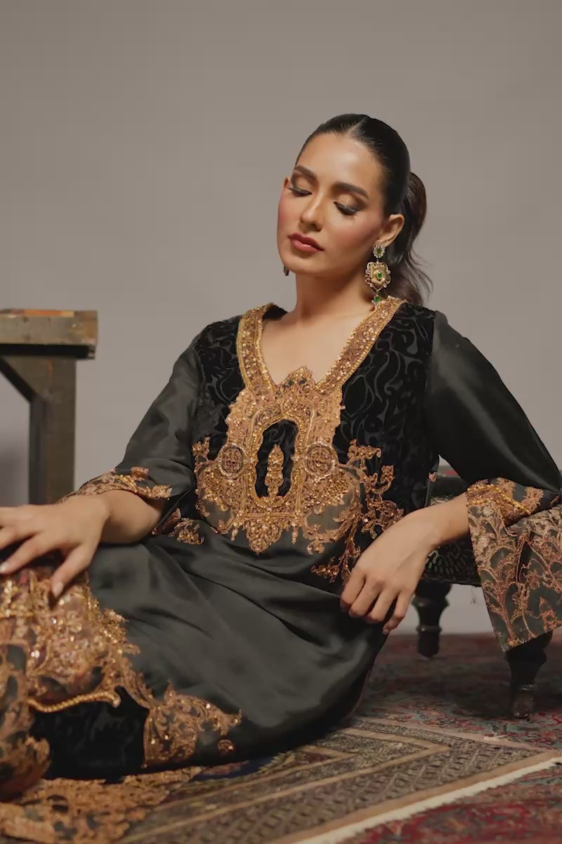 A luxurious silk fabric digitally printed in Black, evoking a vintage aesthetic reminiscent of royal attire. The garment is adorned with intricate embellishments such as zardozi, dabka, and pearls, meticulously placed on the neckline, front panels, and sleeves, adding opulence and sophistication. To complement the regal look, the outfit is paired with a straight pant, contributing to an overall elegant and traditional appearance.