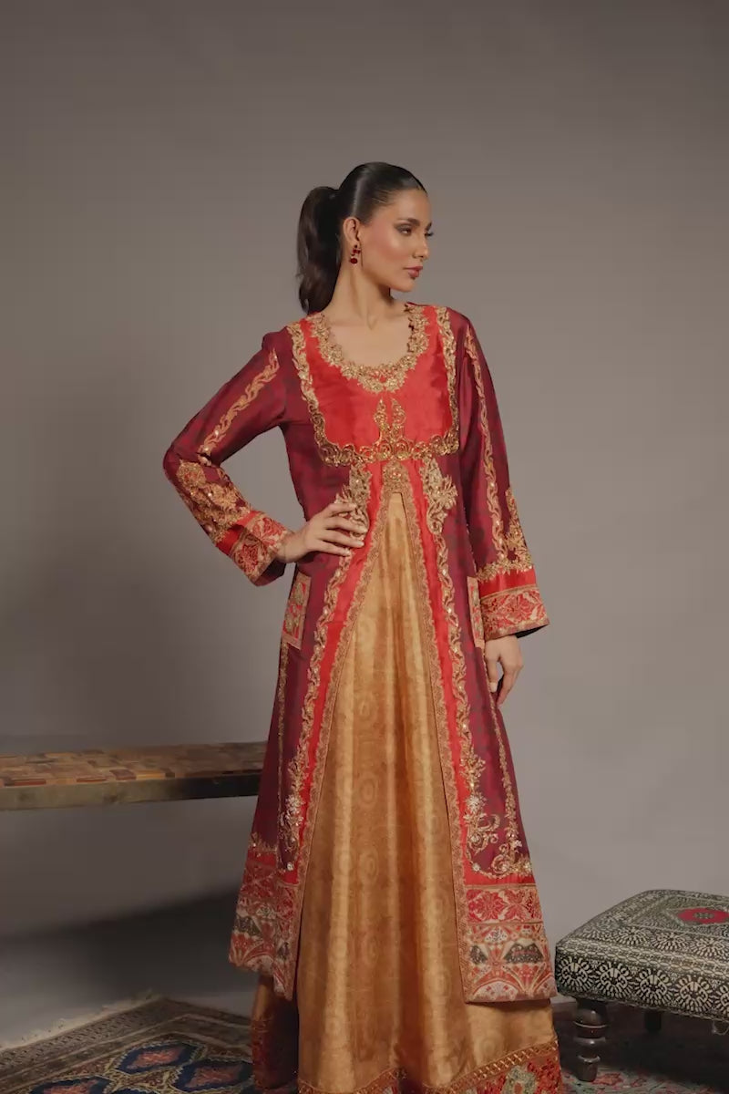 Mughal-inspired elegance in a two-layered sheesha silk outfit with zardozi-inspired Shamaeel Signature print in gold tilla outline and machine embroidered border. A perfect blend of heritage and luxury. Comes with shift dress.