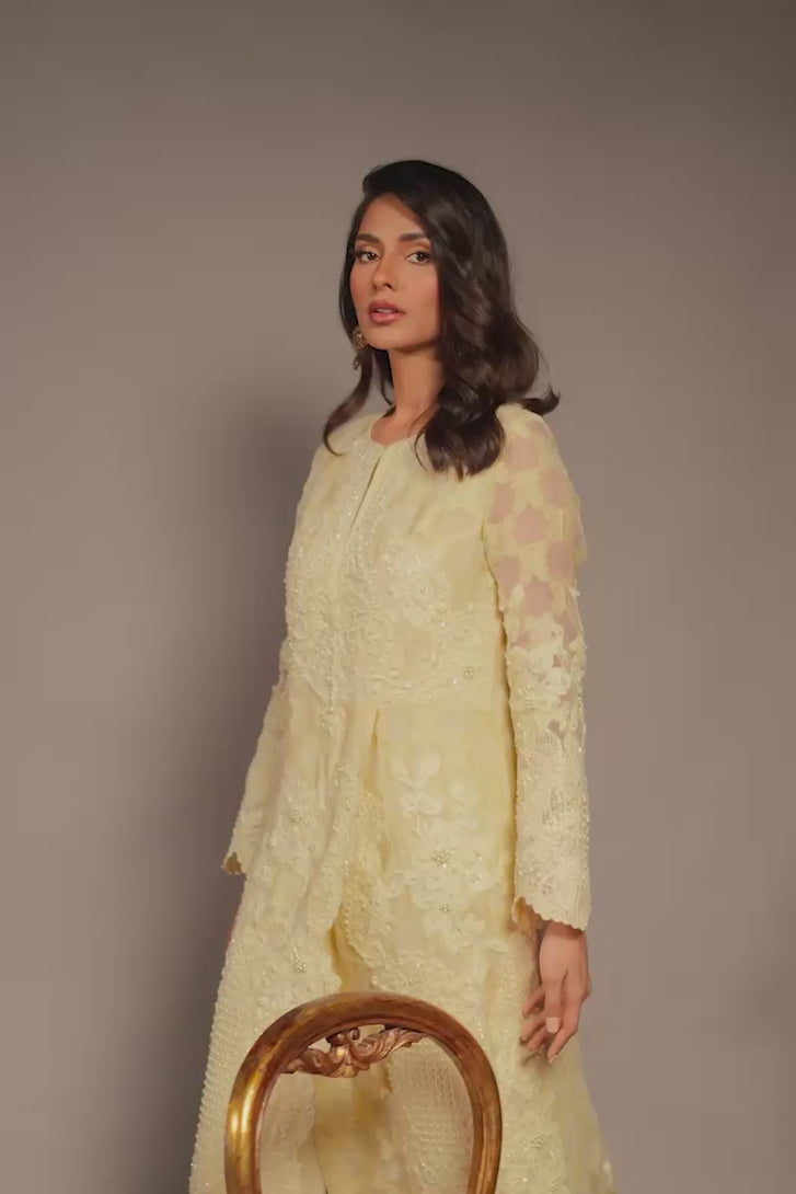 This self-jacquard organza Shirt features intricate ivory embroidery with pearls and a scalloped edge, embodying timeless luxury and grace. It is paired with a straight pants.