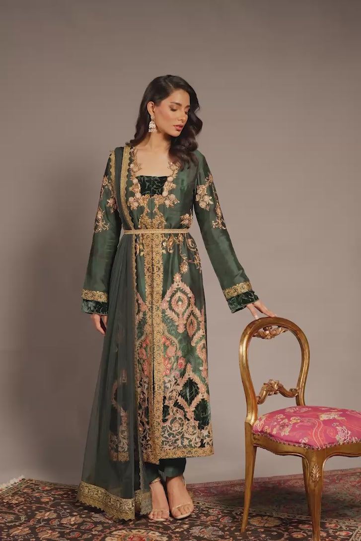 This stunning silk Shirt paired with complimentary pants features an Ottoman-inspired print with antique gold tilla embroidery and zardozi details. Dark green palachi appliqué adds richness, while the green net dupatta with tilla lace completes the look. Dupatta can be added separately.