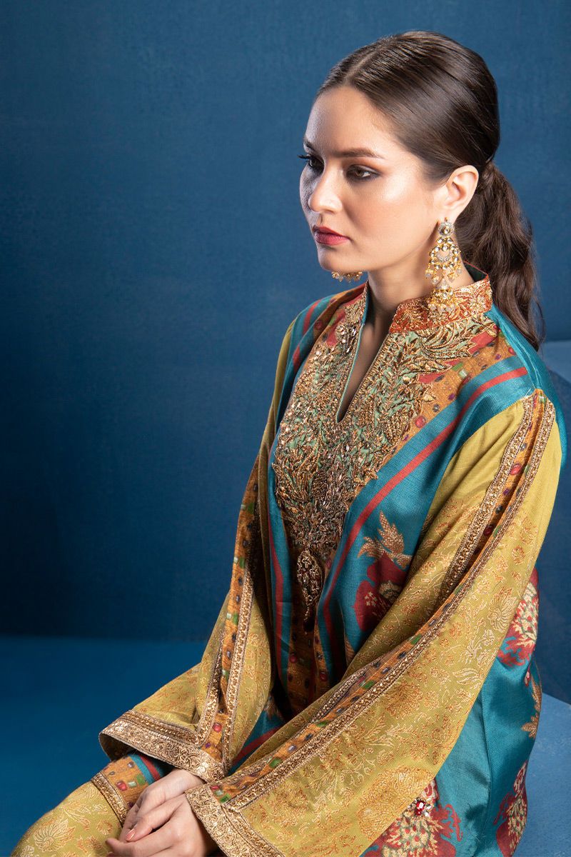 Classic Shamaeel silhouette ethnic digital print printed on silk fabric delicate galla and collar handcrafted with gota, gold tila and sequence work handmade motifs crafted with stones, resham thread and dapka finished with handmade gold sequence and tila thread lace.