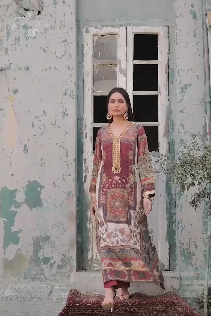 A statement silk ensemble inspired by classical artistry and heritage motifs. The silk shirt features rich, tapestry-like detailing with intricate borders and a balanced palette of warm saffron and earthy tones. Paired with fluid silk pants, the silhouette flows with effortless grace and quiet grandeur. Designed for women who appreciate depth, culture, and refined elegance, this look embodies timeless craftsmanship with a modern couture sensibility.