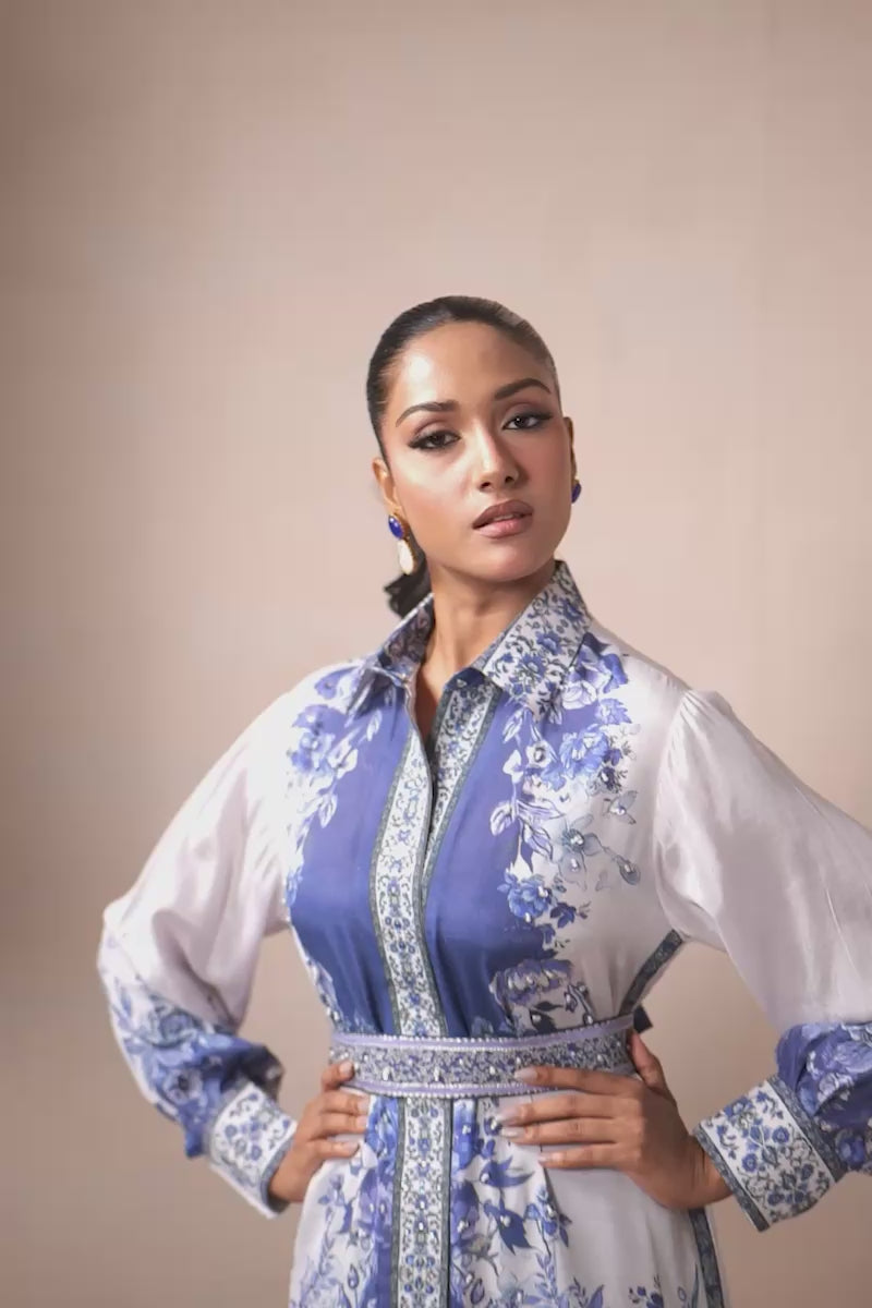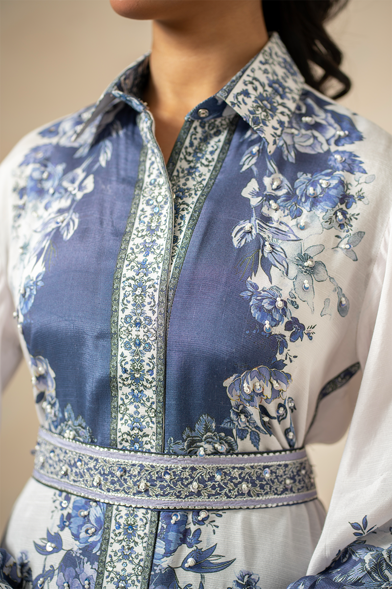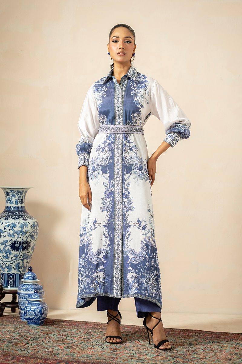 A breathtaking blue-and-white long shirt inspired by classic porcelain artistry — detailed with intricate borders and delicate florals, paired with straight pants for a graceful, modern silhouette and embroided belts. This blue ensemble is a timeless ode to Shamaeel Ansari’s signature blend of art, heritage, and contemporary elegance. The long shirt features a stunning porcelain-inspired print, showcasing soft florals and ornamental patterns in varying shades of blue, indigo, cobalt, and ivory. The design is complemented by a structured collar, button-down panel, and intricate border detailing that runs along the neckline, cuffs, and front placket. A detachable belt subtly defines the waist, offering the option of a more tailored, refined silhouette. The straight blue pants add balance and sophistication, completing the look with effortless charm. Perfect for lunches, art events, resort evenings, and sophisticated daytime gatherings — this ensemble is a wearable artwork that stands out in any setting.