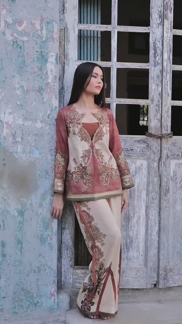 An elegant silhouette crafted in luxurious silk, featuring a delicately embellished short coat layered over a refined inner and paired with straight, fluid pants. The design balances structure with softness, where intricate detailing meets effortless tailoring. Understated yet powerful, this ensemble speaks to timeless craftsmanship, modern femininity, and a poised sense of luxury that transcends seasons.