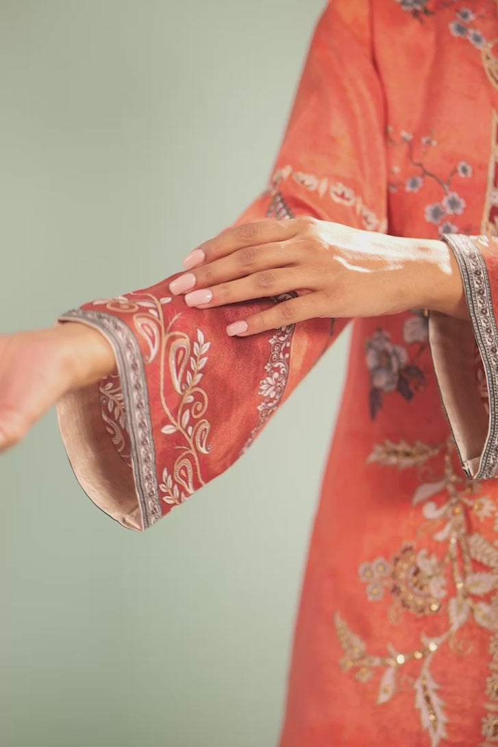 This elegant terracotta-hued kurta features intricate digital embroidery that blooms across the front in soft shades of beige, gold, and brown. The design showcases a harmonious blend of floral and ornamental motifs, creating a refined and artistic look. The neckline is delicately patterned, adding subtle sophistication, while the long, wide sleeves are adorned with coordinated borders that enhance the overall charm. Finished with an intricately designed hem and paired with solid matching trousers, this outfit offers a perfect balance of tradition and modern style. Ideal for daytime gatherings, festive events, or refined casual wear.