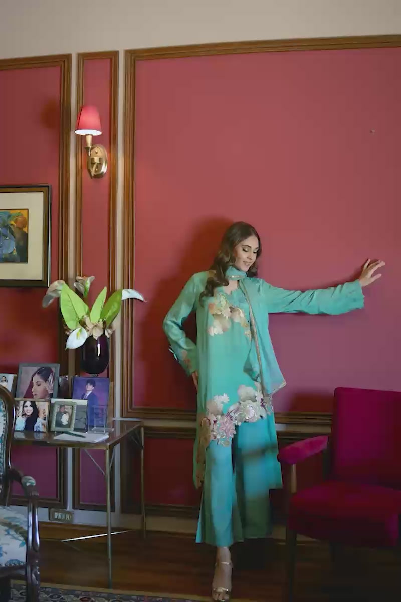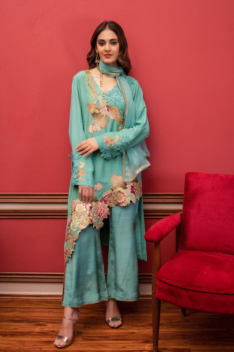This chic high low plain silk shirt features applique work with 3D flower accents. It comes with matching pants with long slits on the side. You can coordinate with dupatta finishing with embroidered border. Dupatta can be added separately. This outfit is a versatile choice for both casual outings and formal gatherings.