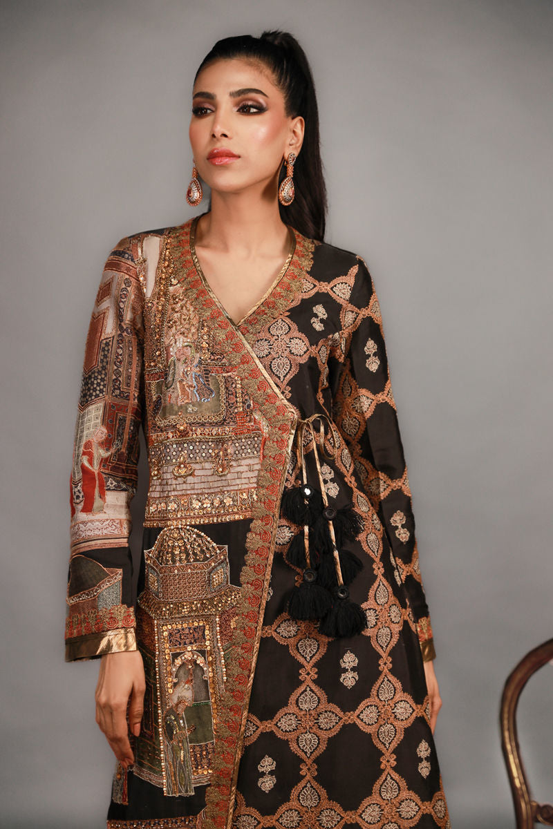 Experience the allure of Ottoman heritage with this exquisite anghrakha, featuring original Shamaeel miniature prints enhanced by intricate handwork and embellishments. This masterpiece captures the essence of the hierarchy of Ottoman queens, reflecting their grace and elegance. The geometric patterns outlined in metallic dull gold tones set this garment apart, adding a luxurious touch to the overall design. With rich embroidery textures and intricate details, this anghrakha is fully designed for formal events, making it a perfect choice for those seeking sophistication and style.
