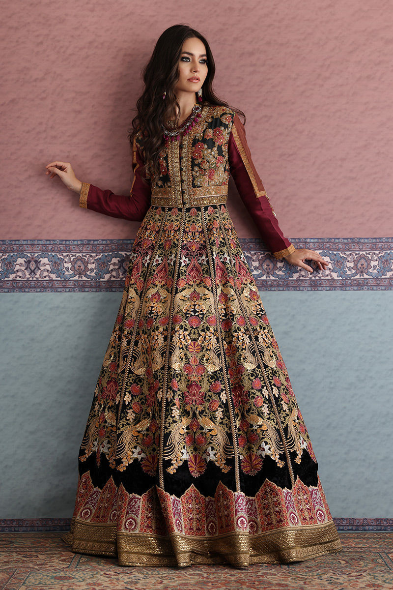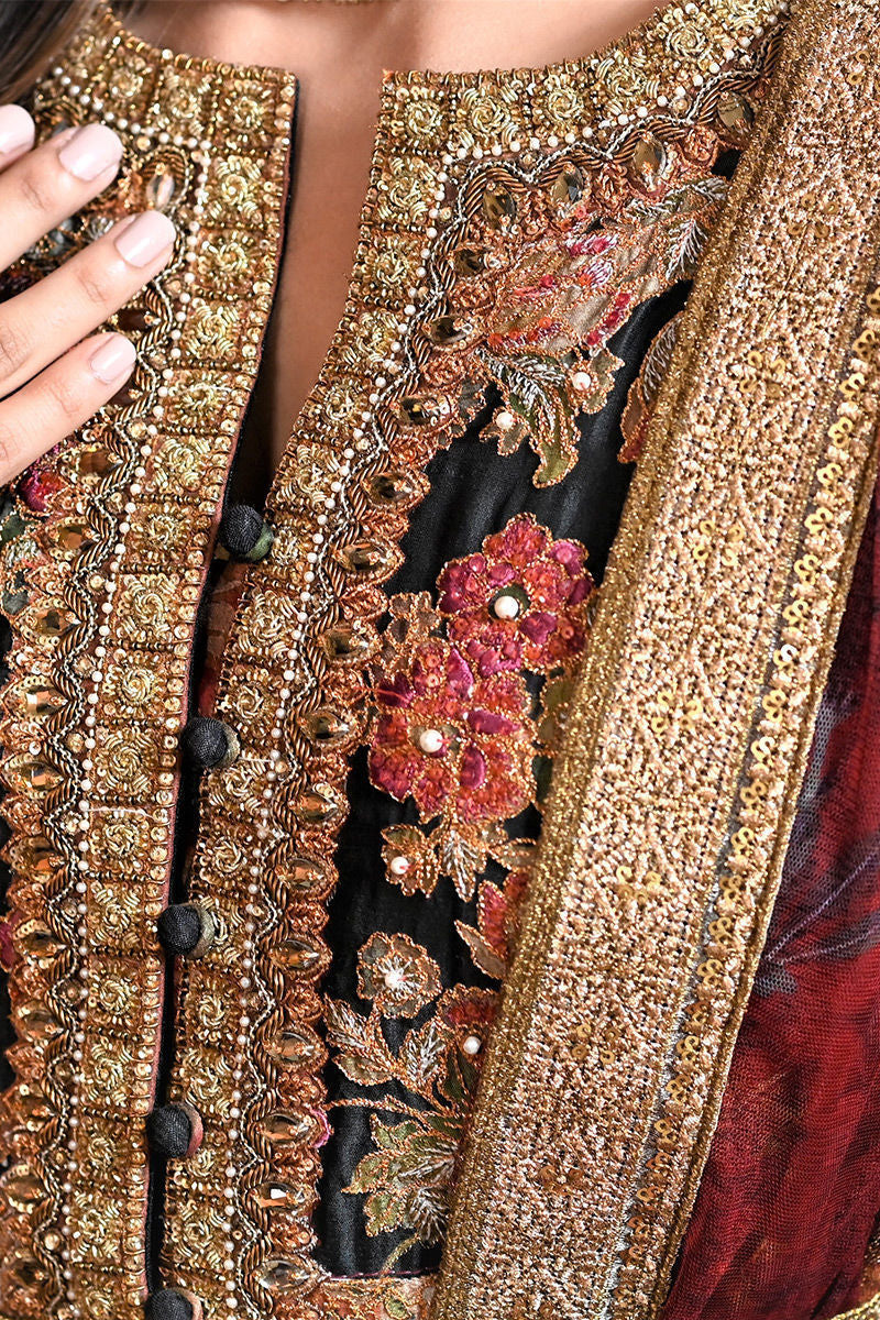 Shamaeels elaborate and ethereally romantic silhouette, pure silk fabric royal flowly dress beautiful floral printed bodice enhance with delicate hand stitch work with pearls and gold tila thread intricate embroidered panels in royal resham thread colours enhanced with dull golden sequence delicate hand embroidered border with beautiful heavy embellished galla patti created with zardozi work and finished with hand crafted dull gold sequence and tila thread lace. Looks best when paired with stunning royal net duppatta.