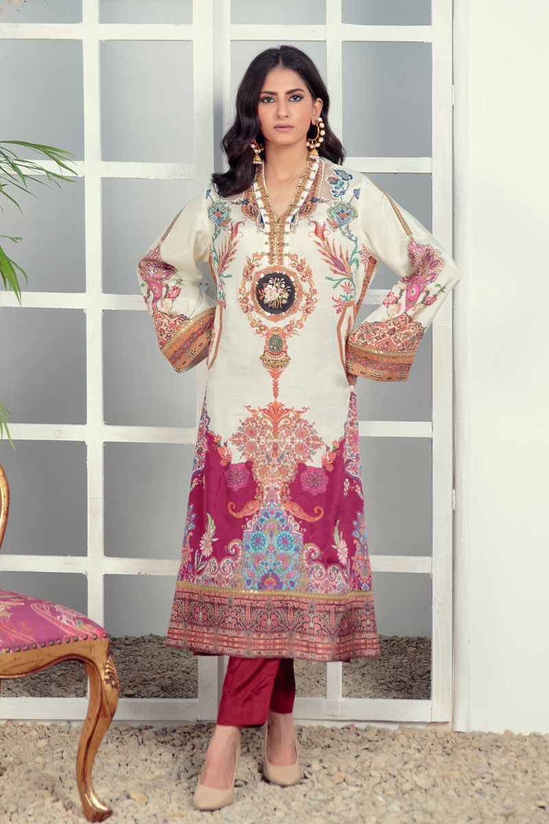 This enchanting attire is a harmonious symphony of intricate craftsmanship and delicate hues of ivory and pink. Neckline is crafted with handworked patti and applique details. Zari outlines delicately trace enchanting patterns, adding a touch of regal grandeur. Looks best when paired with the matchig dupatta and pants.