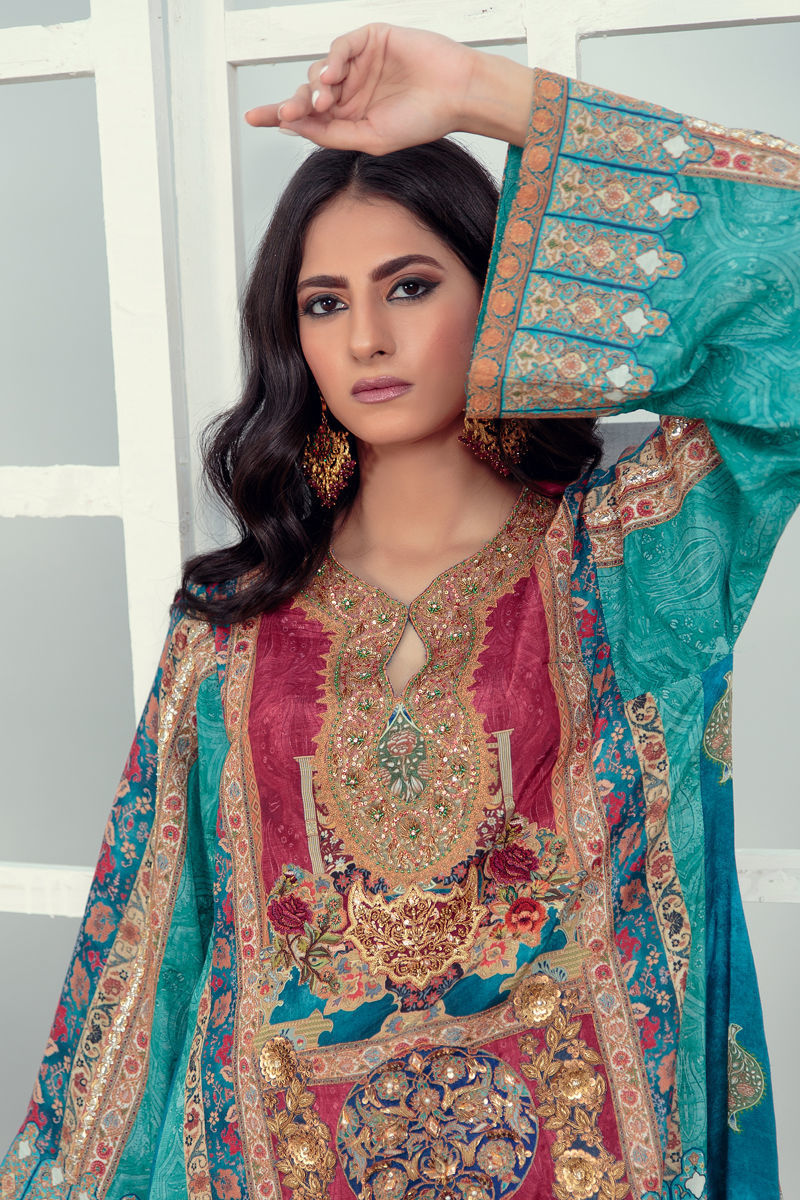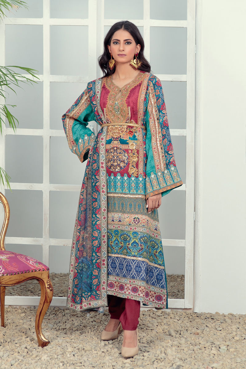 Classic straight silhouette for the shirt. This silhouette is timeless and versatile, suitable for various body types and occasions Mughal-inspired motifs print on silk fabric which shows smooth texture and intricate motifs beautifully. Different shades of blues is used such as navy, royal blue, and teal. Traditional Zardozi embellishments are done on the shirt to enhance the pattern. Handcrafted zardozi work on the neckline. Can be Paired with beautiful net Dupatta & pants can be added seprately.