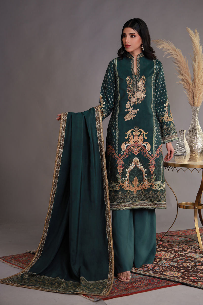 This stunning emerald green traditional ensemble exudes elegance and sophistication. The long shirt is richly adorned with intricate golden machine embroidery, featuring floral and architectural motifs that cascade from the neckline down to the hemline. The sleeves are delicately embellished with subtle patterns, while the hem is bordered with elaborate detailing that enhances the regal appeal. Paired with plain emerald green trousers, the simplicity of the bottoms balances the ornate top. The matching dupatta, with its golden embroidered border and scattered motifs, adds a graceful finishing touch to the ensemble, making it ideal for formal or festive occasions.